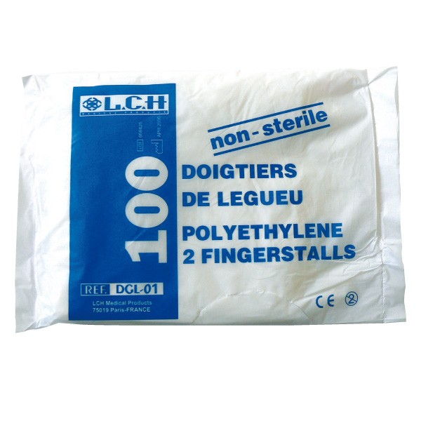 Doigtiers médicalement propres sous emballage de 100 pochettes individuelles dans un sachet distributeur.