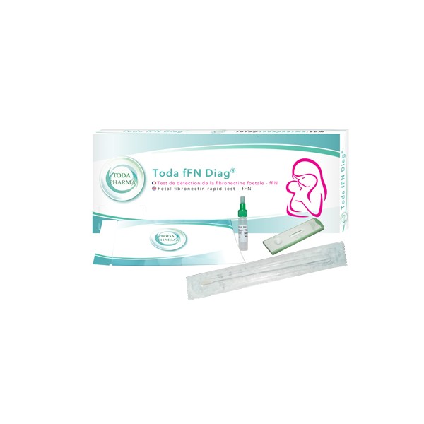 TODA fFN DIAG® est un test immunochromatographique sur cassette permettant de détecter le risque d’accouchements prématurés par la mise en évidence de la protéine Fibronectine Foetale (fFN) provenant des sécrétions cervico-vaginales de la femme enceinte. Le test utilise une paire d’anticorps monoclonaux qui détectent la protéine à partir d’un écouvillonnement vaginal.